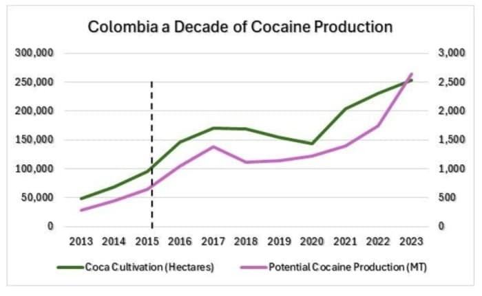 داده های UNODC نشان می دهد که حجم زمین (اسپانیایی) زیر کشت کوکا در سال 2023 با 10 درصد رشد سالیانه به رکورد 625176 هکتار یا 253000 هکتار رسیده است. این اتفاق علیرغم اقدامات قابل توجهی که بوگوتا برای جلوگیری از کشت کوکا و تولید کوکائین انجام داد، رخ داد. حجم کشت کوکا، همانطور که نمودار نشان می دهد، پس از آنکه رئیس جمهور خوان مانوئل سانتوس، سمپاشی هوایی کوکا با گلایفوسیت را در سال 2015 به دلیل شناخته شدن اثرات جدی سلامتی متوقف کرد، افزایش یافت.